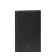 Práctico y de bolsillo, se distingue por la clásica elegancia Maserati. El porta agenda negro hecho en Italia, totalmente de piel, presenta en la cubierta el logotipo del Tridente impreso en caliente. Gran atención en los detalles: dos bolsillos internos, perfectos para llevar agendas horizontales o verticales. Recambio no comprendido. Dimensiones 15 X 9 cm.